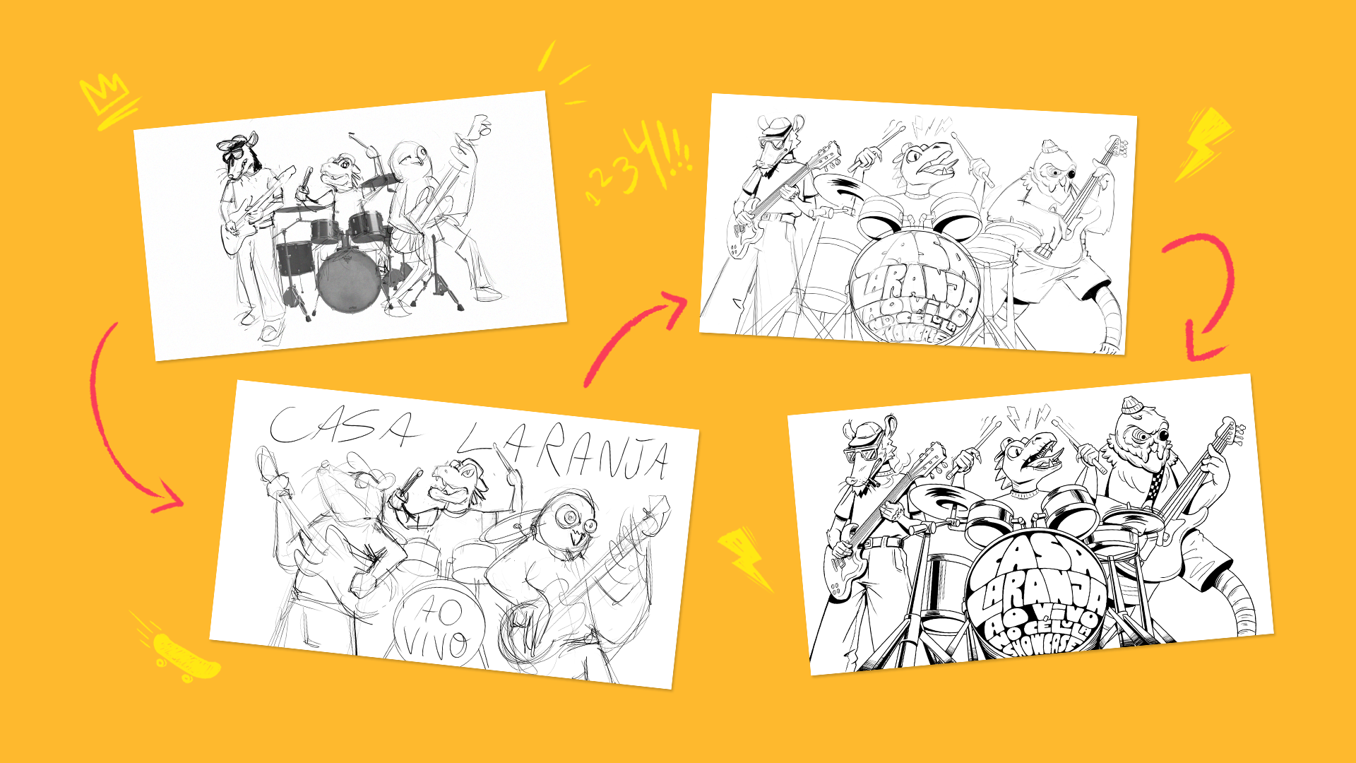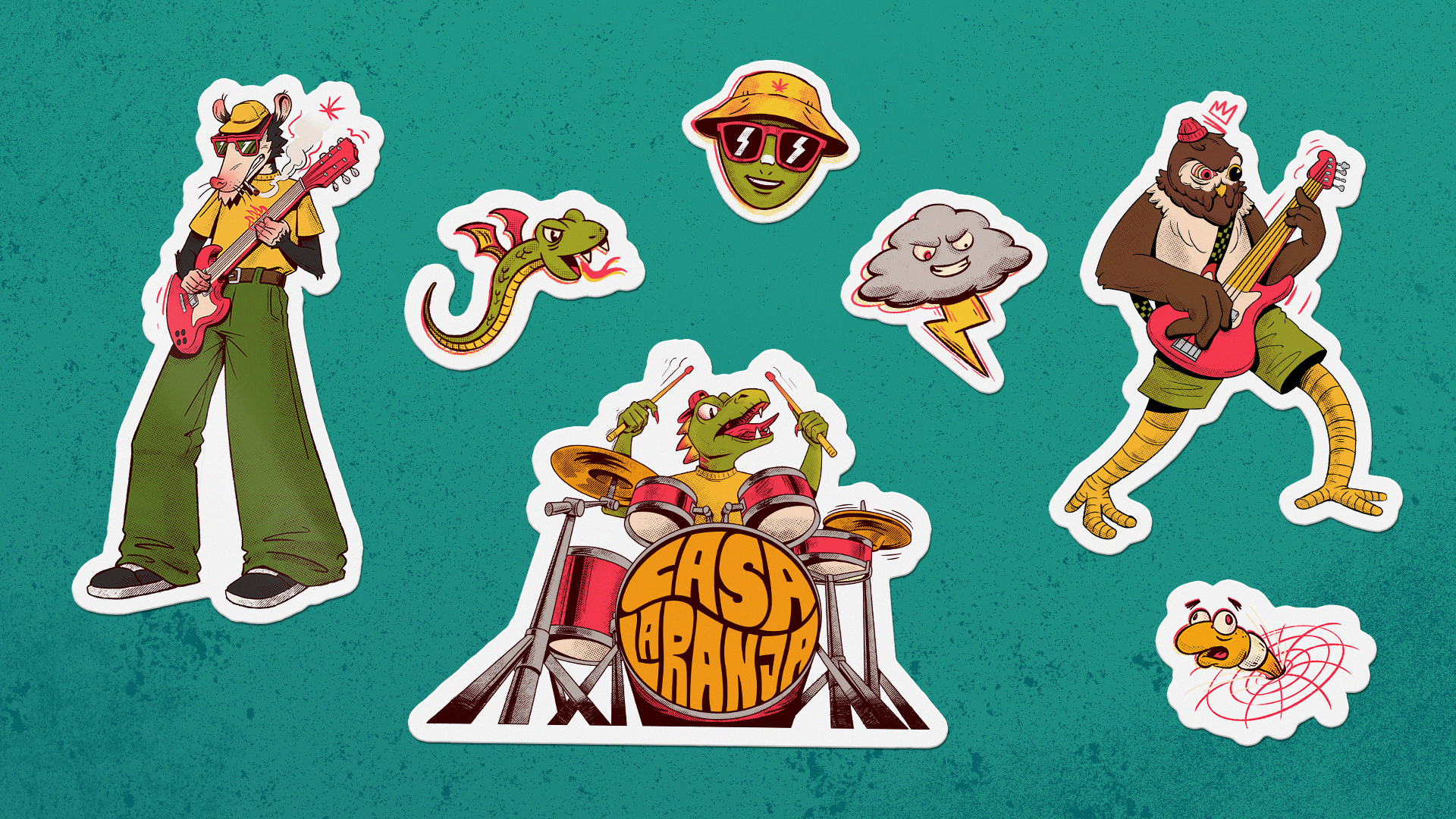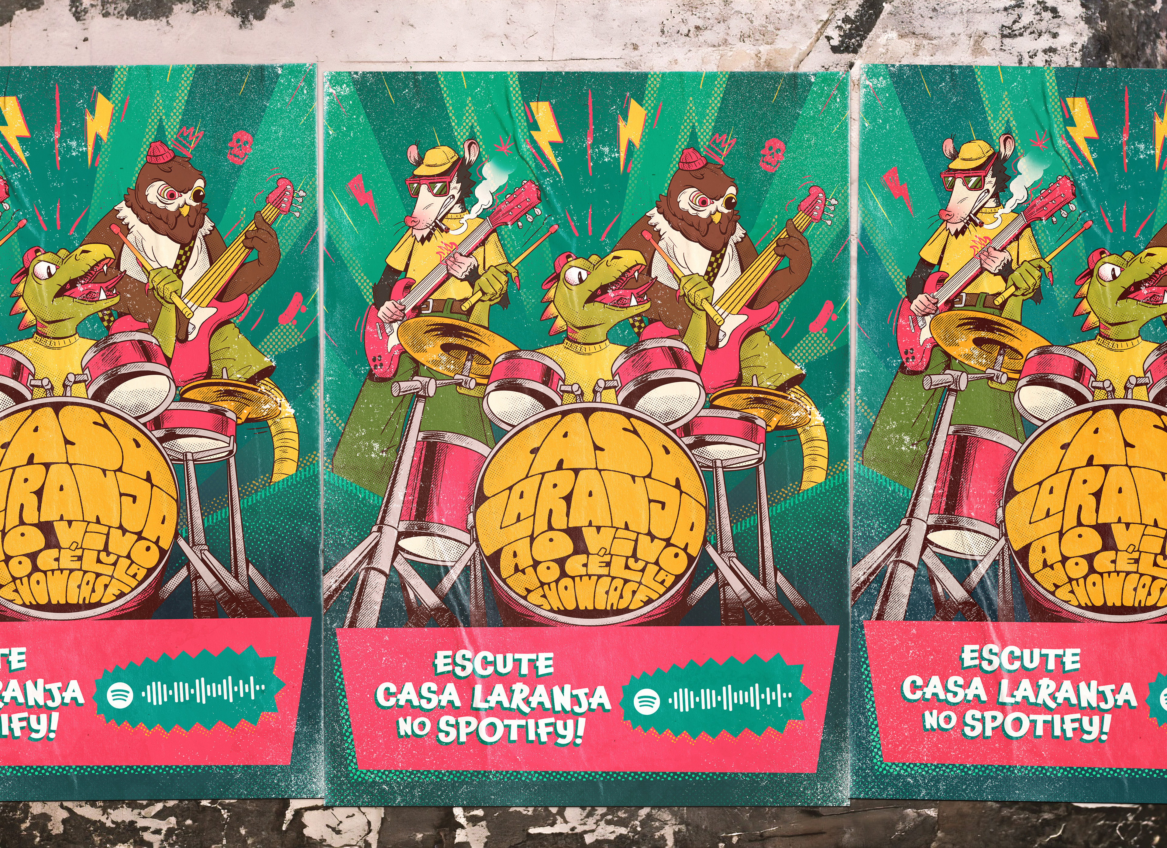 The band Casa Laranja invited me to create the cover art and promotional materials for their new album Ao Vivo no Célula Showcase (Live at Célula Showcase). The concept was to represent each band member as an animal, visually translating the band's energy and intensity.