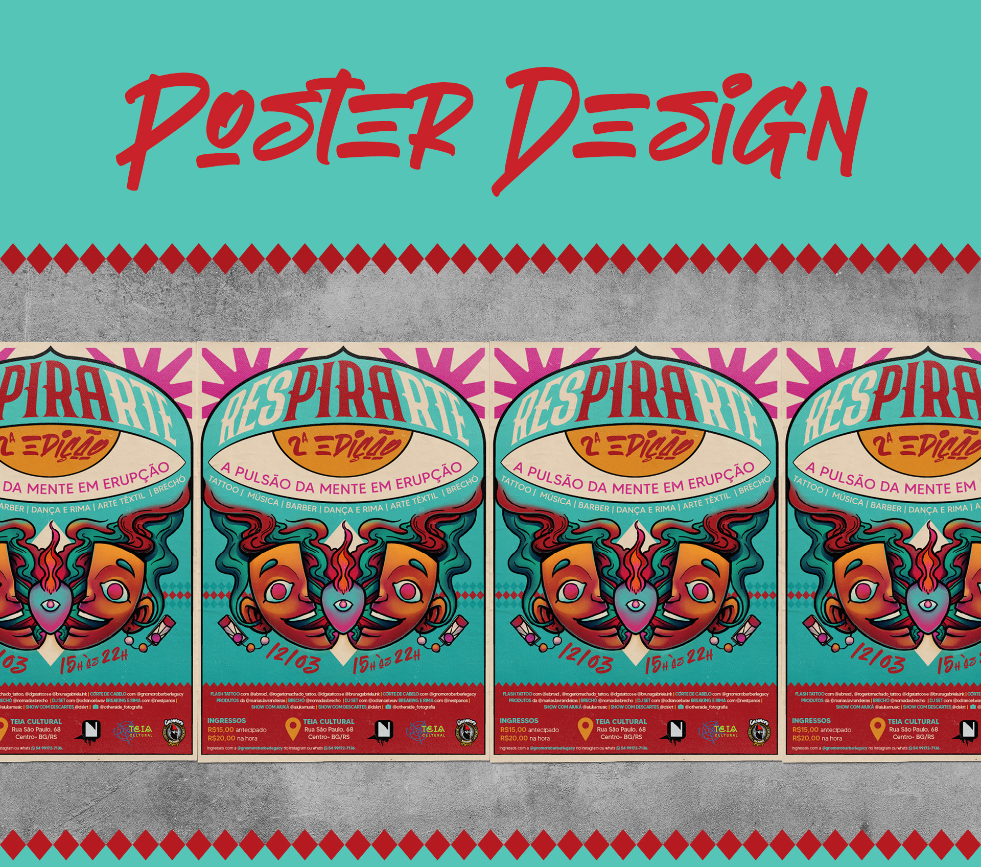 A convite da Gnomoro Barber Leacy criei o material de divulgação da segunda edição do Respirarte, um evento que reúne arte, música, dance, hip hop e a cultura local da região.