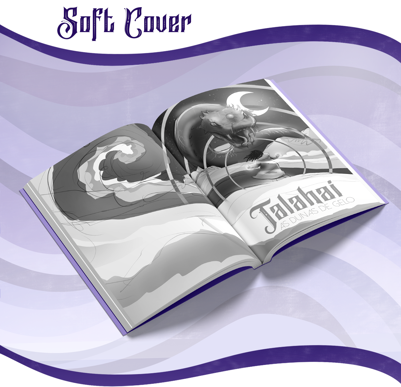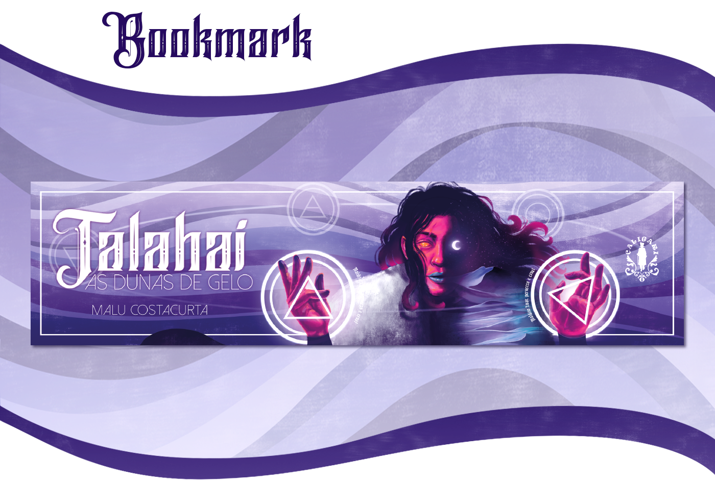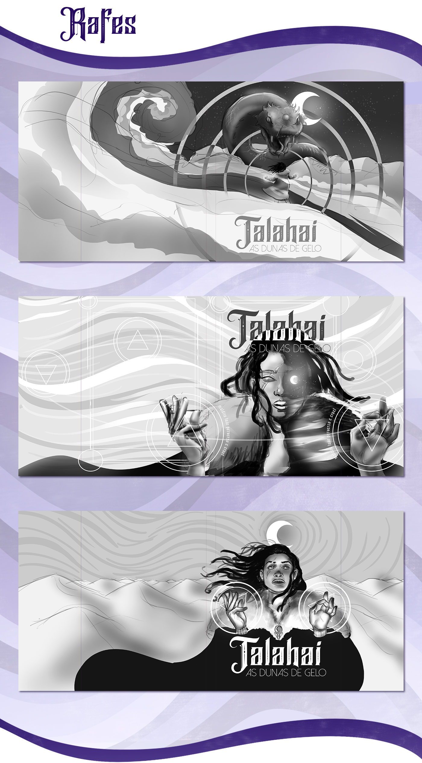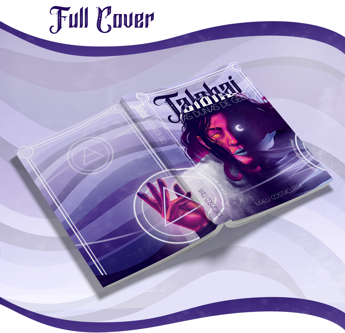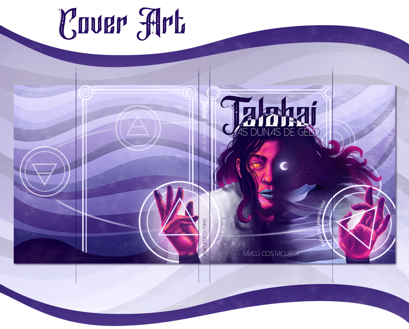 Para a capa, eu quis trazer elementos chave da narrativa: a personagem principal, Safiya, com seus olhos dourados e suas posições de mão, utilizadas para conjurar feitiços; o vento, capaz de levar as pessoas à loucura; o deserto de gelo, cenário dessa aventura; e o luar, uma entidade perversa e cruel.